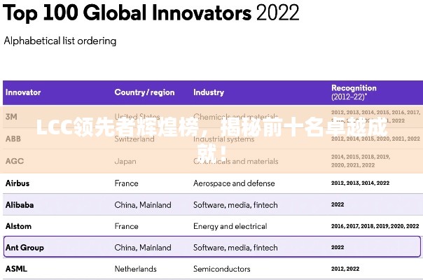 在LCC的领域中,目前排名前十名的实体凭借其优秀的表现、卓越的业绩和持续的创新力脱颖而出,这些领先者在不同领域都有出色的表现,包括科技、教育、商业等,展现出了极高的竞争力。